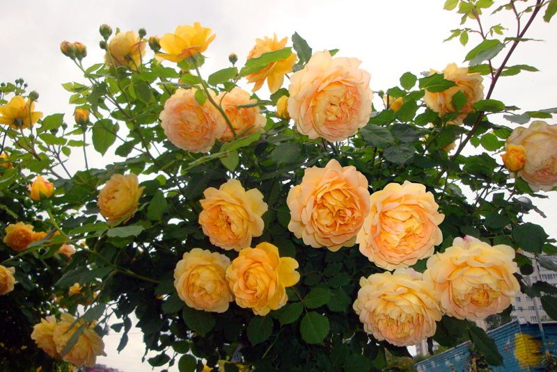 Цветки этой розы имеют густомахровую структуру и достигают 8-14 см в диаметре. Внутренние лепестки образуют чашевидную форму, а внешние слегка отогнуты. Основной цвет – насыщенно яично-желтый, но могут присутствовать персиковые или розовые оттенки, создавая медно-желтый тон. Цветки появляются в небольших кистях и часто поникают. Аромат легкий или средний, с пряными или фруктовыми нотками. Роза обильно цветет ранним летом, а затем повторяет цветение волнами до конца сезона. Побеги слегка или умеренно колючие, дуговидные, с блестящей ярко-зеленой листвой. Куст округлый и раскидистый, достигает 120-150 см в высоту и ширину в холодном климате, и до 180-200 см в жарких условиях. Эта роза прекрасно смотрится в миксбордере, особенно в сочетании с лавандой или шалфеем. Устойчивость к болезням хорошая, но в регионах с распространенной черной пятнистостью рекомендуется профилактика.