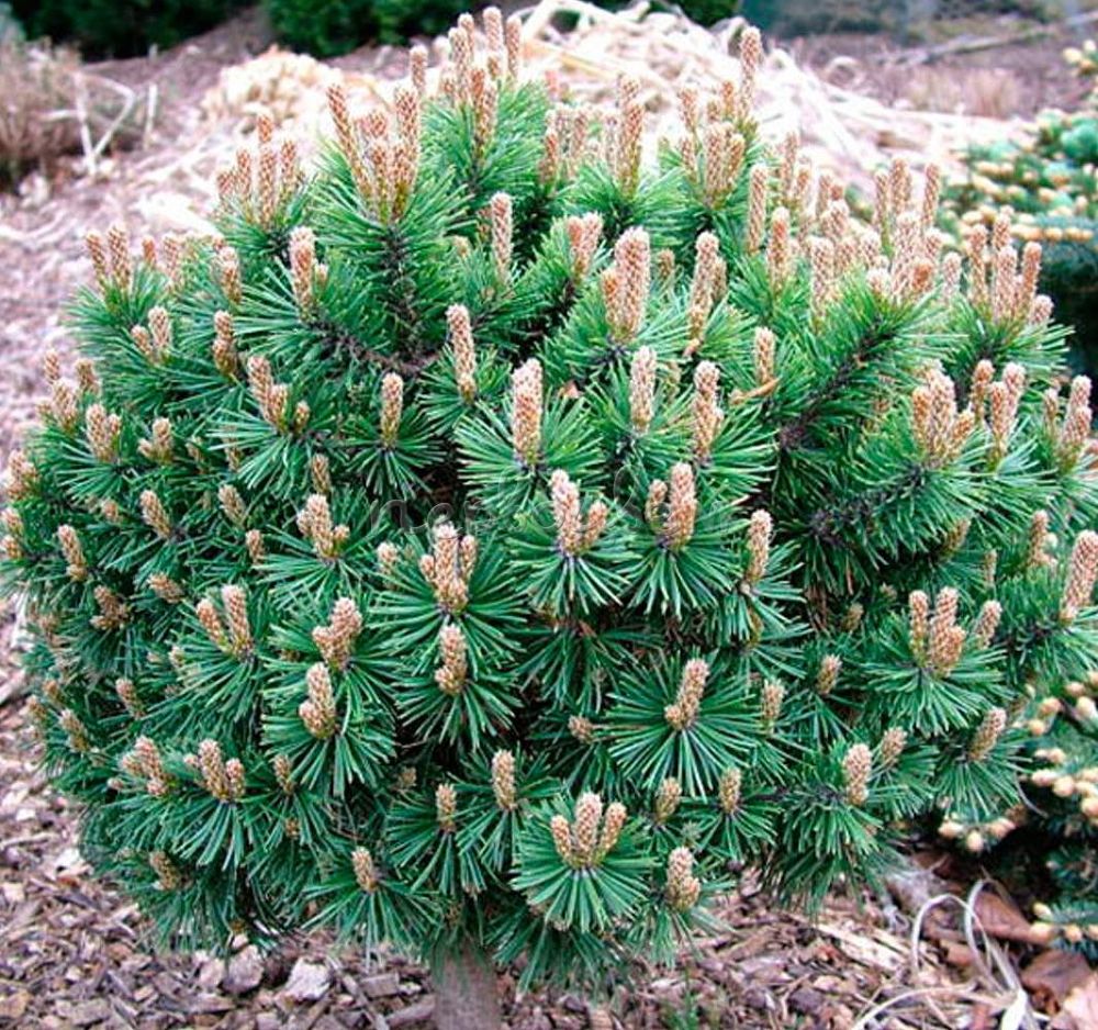 Саженец горной сосны размером от 20 до 40 см пользуется большой популярностью среди садоводов и ландшафтных архитекторов благодаря своим компактным размерам и способности прекрасно вписываться в любые цветочные ансамбли. Это растение сохраняет свою зеленую окраску круглый год и радует приятным ароматом. Хвоя горной сосны собирается в маленькие пучки, которые живут до пяти лет. Корневая система у этого вида разветвленная и поверхностная. С возрастом, примерно на 70-й год, на кустах начинают формироваться небольшие шишки длиной 4-5 см с коричневым оттенком, типичным для хвойных пород.